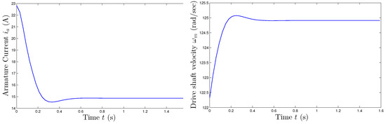 Example of output values of the model of a direct-current electrical motor driven by a step input voltage. Left-hand panel: Armature current versus time. Right-hand panel: Drive shaft angular velocity versus time.