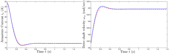 Motor driven by a step armature voltage: Comparison of the output curves. Blue-solid line: Actual motor response. Red-crosshatched line: Inferred motor model response.