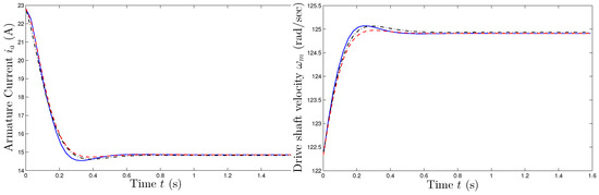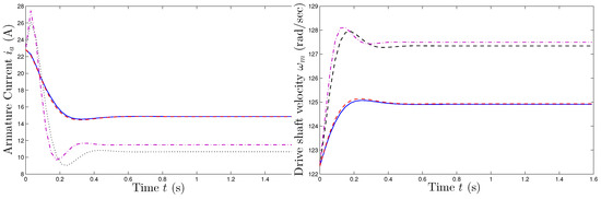 Motor driven by a step armature voltage: Comparison of responses corresponding to the values of the parameters reported in