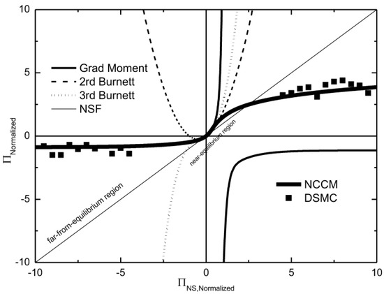 - The NCCM has a different nonlinear trend than those of the Burnett equation and the Grad moment method in the far-from-equilibrium region. Note that both the Burnett equation and the Grad moment method cannot be used in far-from-equilibrium states. In contrast, the NCCM shows the opposite trends as those of the Grad moment and Burnett methods. This finding has been validated by the DSMC method, as shown in Figure 1. This feature indicates that the NCCM can be used to describe the gas flow in the far-from-equilibrium state.
