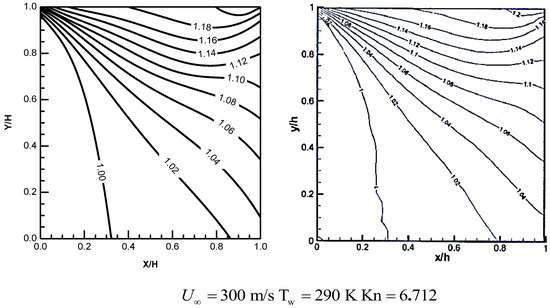 Lid-driven cavity flows are studied at high Knudsen numbers. The cavity has a fixed wall temperature Tw = 290 K. The Knudsen number is defined as the ratio of the mean free path to the length of the cavity’s side wall, and the mean free path of gas is evaluated for a hard sphere model. Similar to the previous work [28], the wall velocity is for cases at Kn = 0.671 and 6.712. The solutions are compared with the DSMC ones. The computational domain is discretized using a mesh of 100 × 100 cells in physical space. The results of the present study and the DSMC at Kn = 0.671 and 6.712 are presented in Figure 3 and Figure 4, where the temperature contours are shown. Excellent agreements are obtained.