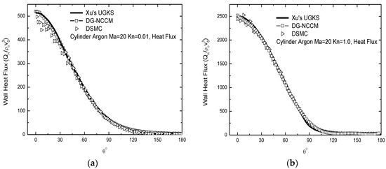 The input parameters for these two cases are Ma = 20, Kn = 0.01 and Ma = 20, Kn = 1.0. The working gas is argon. The heat fluxes around the solid surface are given in Figure 6. Good agreement of the results of the NCCM and the DSMC and UGKS (Unified gas-kinetic scheme) methods [29] was observed. These two cases are of a high Kn number and in the region of far-equilibrium states.