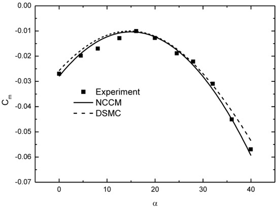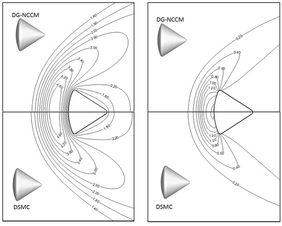 The present authors also validated hypersonic gas flows around a 3D Apollo 6 command module with Ma = 5.0, Kn = 0.5 in the earlier study [4], and good agreement between the results of the NCCM and the DSMC method was observed in this case. Here, we just give the results as can be seen in Figure 9 to prove that the NCCM can solve the problems of far equilibrium. More details can be seen in reference [4].