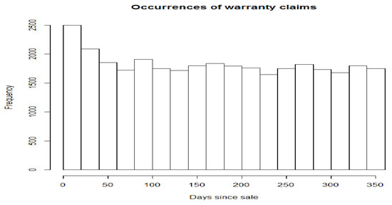 Figure 1 gives a histogram of the occurrence times of claims during the year where each car is potentially under warranty. Except possibly for the first 50 days, the rate of occurrence of claims appears homogenous over the warranty claims time period.