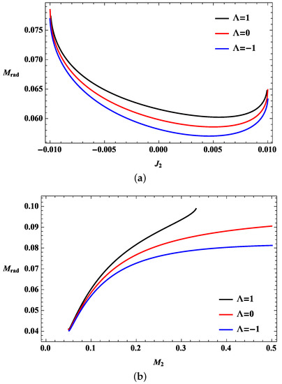 However, for , the minimum mass of the final mass should be obtained by a numerical method because of the non-trivial dependency on the spin parameters of the masses of the black holes. We ignore the entropy and the angular momentum of the radiation because the actual radiation is very small compared with the total mass of the system. Furthermore, in considering the entropy and the angular momentum of the radiation, this does not change its overall behaviors. The general behavior of the radiation remains nearly the same regardless of the cosmological constant, as is evident in Figure 1. As shown by Equation (11), the derivative of the bound on the radiation with respect to the angular momentum of the second black hole is negative.
