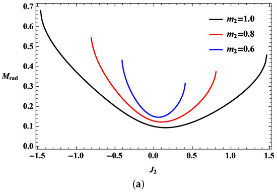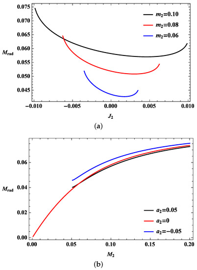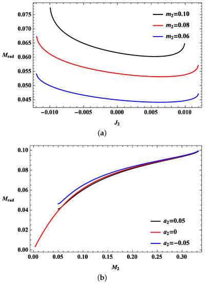The radiation energy depends on the initial conditions of the black holes. Using the given initial conditions of the black holes, which are and for the first one and and for the second one, the upper bound on the radiation and the lower bound on the mass parameter of the final black hole with the spin parameter can specifically be obtained. The first black hole is fixed, and the second black hole is assumed to have mass and angular momentum smaller than those of the first one to describe the radiation in terms of the parameters of the second black hole. Therefore, and . The maximum value of the radiation in Equation (8) can then be calculated using the equality of Equation (10) by imposing Equation (9). By combining the partial derivatives of Equations (8)–(10), the change of the maximum radiation can be expressed in terms of the partial derivative with respect to the angular momentum of the second black hole, thereby making the following leading term:
