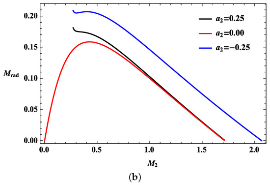Figure 2a,b shows that the radiation bounds normally increase according to the mass of the second black hole, and more radiation can be released by near-extremal black holes. A Kerr-dS black hole with a spin parameter of zero can have an outer horizon with a small mass; hence, radiation can be observed when the second black hole is small. In addition, the minimum masses of the second black hole enable the radiation to be released for the given spin parameters because of the extremal conditions in Figure 2b. The minimum mass is then started at the finite value. The second black hole in the case of does not contribute to the angular momentum; hence, it starts at the point.