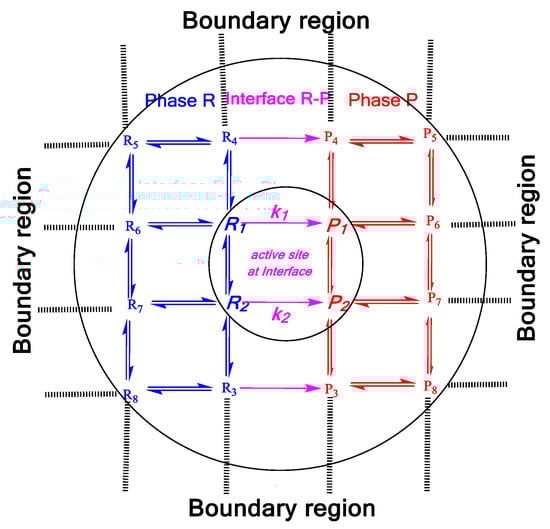 where ωi is the magnitude of the transition-state imaginary frequency (see References [3,4] for more detail). While CKGT describes the collision effects among surrounding gases, vapor molecules, clusters, and droplets, assuming those are in the thermodynamic equilibrium states, QTST presents some kinetic quasi-equilibrium phenomena at an atomic level in the vicinity of fuel droplets. This novel hybrid method bridges micro/macro-scale modelling with atomistic-scale modelling to unravel the kinetic effects at the surface of fuel droplets and elucidate the role of equilibrium thermodynamics in the liquid and gas phases and of transient kinetics in the interfacial flows during the evaporation/condensation process (see Figure 1).
