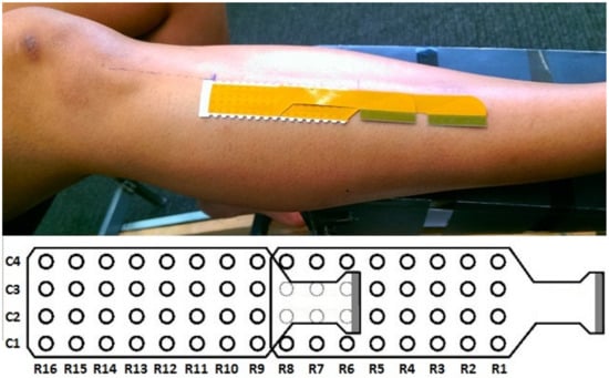 The HD-sEMG was recorded using a 64 channel monopolar recording system (W-EMG, Bitron, Torino, Italy) configured to use two electrode arrays of 32 electrodes (a 4 by 8 grid of electrodes). The electrodes in the array were exposed metal pads on a Kapton substrate with an inter electrode distance of 5 mm. The arrays were arranged into a 4 by 16 grid (4 columns, 16 rows) of electrodes for easy placement over the TA as shown in Figure 1. Double sided foam tape was used to secure the arrays over the muscle. The tape has holes of 3 mm diameter that line up with the electrodes and were filled with a conductive gel allowing the electrodes to contact the skin. The HD-sEMG device uses a 24 bit Analogue to Digital converter (ADC) to sample the sEMG at 2441 Hz, the signals are amplified by 192.75 V/V and band pass filtered (10–500 Hz).
