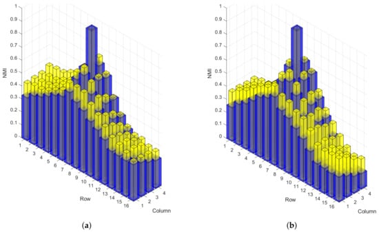 The total NMI for each electrode represents a similarity score between itself and the rest of the electrode array where higher scores indicate a greater degree of dependence between electrodes. From Figure 3, it can be seen that, in all of the plots, there is an area of the array which has consistently higher values of . While the exact location of the IZ for each subject was not verified during the study, the electrode array was placed such that it is likely covering an IZ. It can be expected that the regions with higher total NMI scores are likely to be located over the IZ for the muscle. This is because electrodes that are close to the IZ are close to the origin of the action potentials for various motor units and hence should share a dependence with a large number of the other electrodes.
