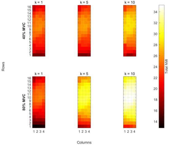 Figure 3 shows the differences in for two MVC levels (40% and 80%) over the duration of the fatiguing contraction from a representative subject. The magnitude maps of shown in Figure 3 are during time segments k = 1, 5, and 10 for one representative subject. The top three plots in Figure 3 show the magnitude of during the 40% MVC contraction and the bottom three are for the 80% MVC contraction. The horizontal axis is the columns of the array and the vertical is the rows in the array. The colour of each point on the plot represents the magnitude of (shown in Equation (10)) or alternatively the total NMI for that electrode during time segment k.