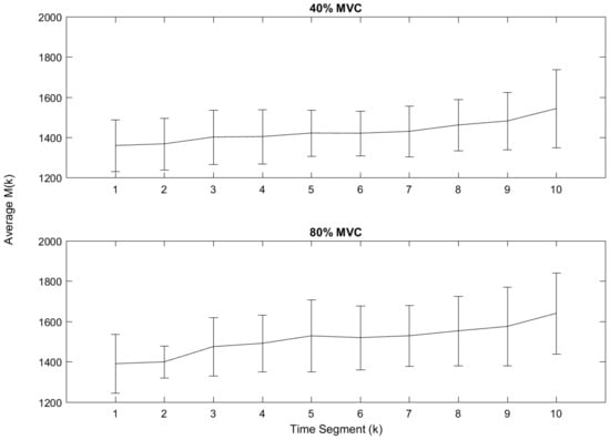 The function, which is the sum of during time segment k, is the overall score of dependences between all the electrodes and can also be thought of as a score for overall similarity. Figure 4 shows the average value of the function calculated from each participant for each time segment k. The upper plot in Figure 4 shows the 40% MVC data and the lower shows the 80% MVC data. The vertical axis represents the average value of , the horizontal axis is the time segment, k, and the error bars represent the standard deviation for each point. It can be seen from these plots that the average steadily increases over time for both 80% and 40% MVC, illustrating the progression of muscle fatigue.