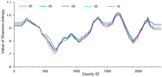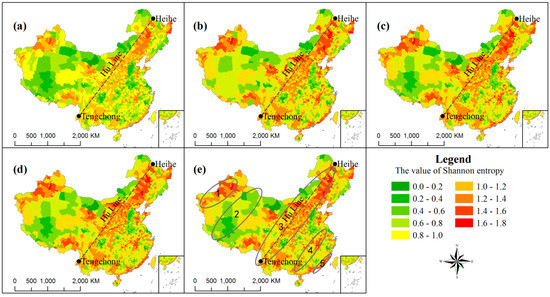 - Through the analysis of Shannon entropy, the entropy of China’s LUCC is uneven in time and space distribution; there is a large trend from 1990 to 2010, and the central region generally has high entropy in space, especially near the Hu line.