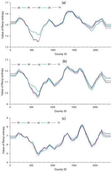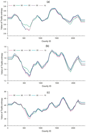 - In the case of q = 2.5, Renyi and Tsallis entropies can also reflect the volatility of the LUCC. Renyi and Tsallis entropies of the LUCC can reflect the extreme cases of the LUCC in the case of q = 0.1/q = 0.5.