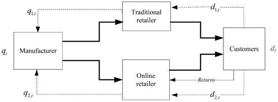 In this paper, we establish a supply chain system that consists of one manufacturer and two retailers, one of which is a traditional retailer and the other is an online retailer. The two retailers sell similar products to a common market, and there is a competitive relationship between them as shown in Figure 1.