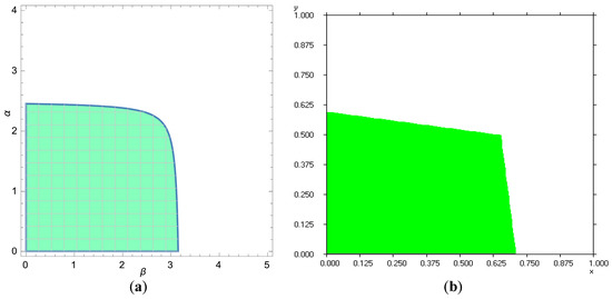 In order to obtain a better understanding of the stability characteristics of the system, we assign fixed values to the parameters. Unless otherwise specified, the parameter values will be still used in the following article. Without loss of generality, we set the parameters for , , , , , . At this moment, the stability region of the deterministic system of Equation (8) is shown as the green part in Figure 2a. The stability region of system is determined by both retailers’ adjustment speed parameter. For both retailers, when the speed of the sales adjustment is in the stable region, the system tends to a Nash equilibrium point after a finite game; otherwise, the system is unstable.