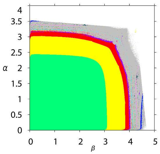 Figure 3 shows parameter basin of the deterministic system of Equation (8), in which different colors represent different states. Besides the green stable state, the yellow area is cycles of period 2, purple for period 4, gray for chaos, and white for divergence. With the growth of α and β, green, yellow, red and purple constitute the road from period doubling bifurcation to chaos. In the discrete system, it is also known as the flip bifurcation. It is worth noting that there are also some intermittent odd periodic points in the chaotic region of the deterministic system of Equation (8), and we call them topological chaos. In Figure 3, we can find that there are two roads leading to the chaos: