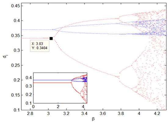 Secondly, we investigate the change of two retailers’ sales volumes with respect to the adjustment speed parameter of online retailer via the bifurcation of the deterministic system. Figure 4 shows the bifurcation diagram of the deterministic system with and varying from 2.7 to 4.3. The small window in Figure 4 shows the whole bifurcation diagram when . The red line is the sales volume of the online retailer and the blue line represents that of the traditional retailer. As shown in the diagram, when the value of is less than 3.03, the sales volumes of both retailers are stable and the traditional retailer sells much more products than the online retailer. Once the adjustment speed of the online retailer grows larger than 3.03, the system experiences the bifurcation and enters into the two-period state. After four-period and eight-period, the system will finally fall into chaos. Apparently, the online retailer will be affected much more by the growth of and the vibration amplitude of its sales volume is more than that of the traditional retailer.