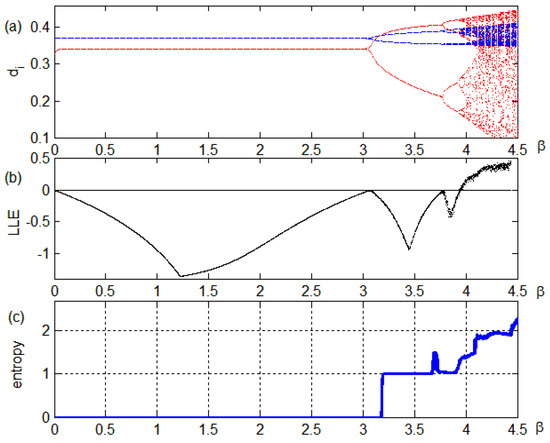 (a) Quasi-bifurcation; (b) Largest Lyapunov exponent; and (c) Entropy diagram.