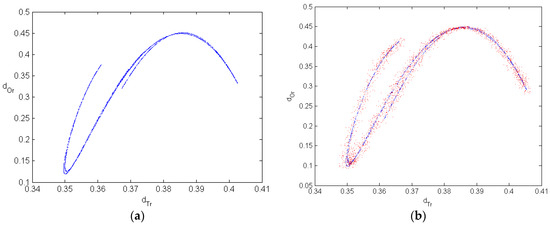 Next, we study the complexity with the help of the system’s attractor. Figure 6 shows attractors of system (8) and its deterministic system when . In Figure 6a, the blue line is the chaos attractor of the deterministic system, while the red points around the blue line is a quasi-chaos attractor with weak noise in Figure 6b.
