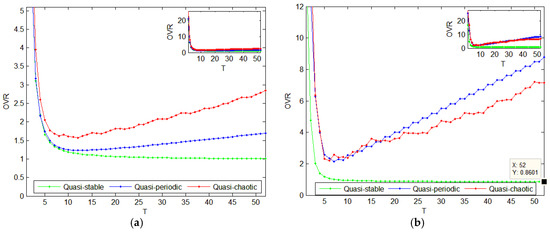 In the three different states, we can find some properties by calculating the order variance ratio. Figure 8a gives the order variance ratio diagram of the traditional retailer when the system is in the quasi-stable, quasi-periodic or quasi-chaotic states, respectively. The small window in the north-east corner of Figure 8a is the whole diagram, while the big figure is a magnified image when . In the quasi-stable state, with the passage of time, the order variance ratio will decrease rapidly close to 1 during the first ten periods, and be stable at 1 in the time later. While in the quasi-periodic and quasi-chaotic state, the order variance ratio will gradually increase after a rapid reduction, since time . Figure 8b gives the order variance ratio diagram of the online retailer when the system is in the quasi-stable, quasi-periodic or quasi-chaotic states. The small window in the north-east corner of Figure 8b is the whole diagram, while the big figure is a magnified image when . There is the similar trend for the OVR of the online retailer in the quasi-stable state. Unlike the traditional retailer, the of the online retailer is greater in the quasi-periodic and quasi-chaotic states. After time , the of the online retailer in the quasi-periodic state is larger than that in quasi-chaotic state.