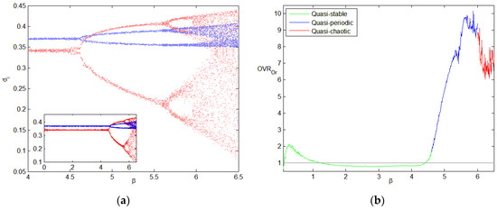 When the noise intensity is set to 0.001, we can plot the quasi-bifurcation diagram of the demand model and LLE of system (7) in a figure. Figure 5a,b give the quasi-bifurcation diagram and the corresponding LLE, with and from 0 to 4.5. As shown in the figures, the LLE is less than zero when . Therefore, the deterministic system of Equation (8) is in the stable state. However, system (8) is in a quasi-stable state rather than a pure stable state, i.e., the sales volumes of retailers are not determined at fixed values and fluctuate around their equilibriums slightly. The same phenomenon occurs in the period-doubling bifurcation stage, and the system is more chaotic in the quasi-chaos state.