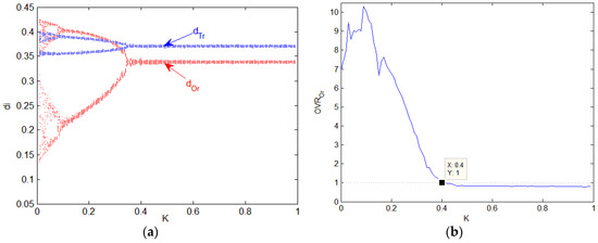 From Figure 11a, we can see that when , the system is in a quasi-two-fold period state; when K > 0.4, the competition system is out of chaos and enters into a quasi-stable state. Figure 11b shows the impact of the control parameter K on OVR. As the control parameter grows from zero, the OVR of the online retailer remains high and volatile until K > 0.2. There is a rapid descent of OVR when the control parameter is in the interval [0.2, 0.4], especially, OVR is equal to one when K = 0.4, and less than one when K > 0.4, i.e., the bullwhip effect is mitigated thanks to K.