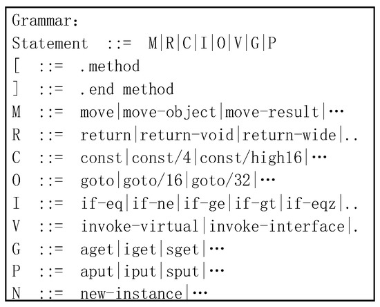 Dalvik Reduced Instruction Set (DRIS) is based on a grammar proposed by literature [21] and shown in Figure 1. DRIS refers to the processing of a Dalvik assembly sequence, which reflects the program semantic instruction program, such as goto, if, move, invoke and so on. DRIS removed independent instructions and interference, such as jump destination address and register parameters. Finally, the single letter is used to substitute the extracted instruction and to obtain sequences. This sequence can represent the semantics of code. The use of DRIS will be introduced in Section 4.