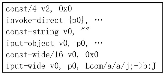 - Wognsen, E.R.; Karlsen, H.S.; Olesen, M.C.; Hansen, R.R. Formalisation and analysis of Dalvik bytecode. Sci. Comput. Programm. 2014, 92, 25–55. [Google Scholar] [CrossRef]