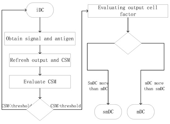 DCA is a population-based algorithm. The population in a DCA is filled with Dendritic Cells (DCs). Dendritic Cells (DC) are a kind of special antigen presenting cell that is sensitive to the change of environment. The main functions of a DC are processing signals and representing antigens. DC is divided into three states: immature DC (iDC), semi mature DC (smDC), and mature DC (mDC). When the Costimulatory Molecules (CSM) signal concentration reaches the threshold, the iDC will be changed to smDC or mDC, which is determined by the concentration of semi-mature output signal and mature output signal. The transformation relations of DC’s three states are shown in Figure 3.