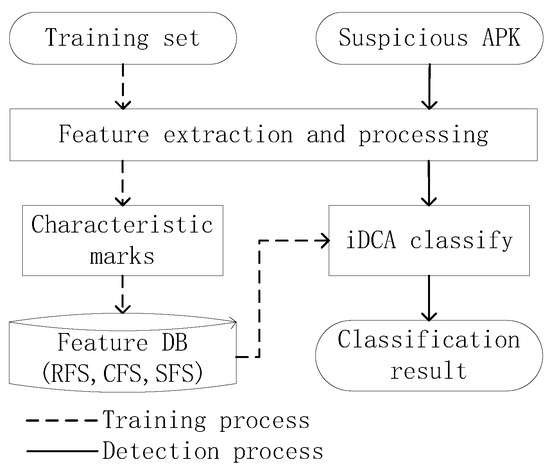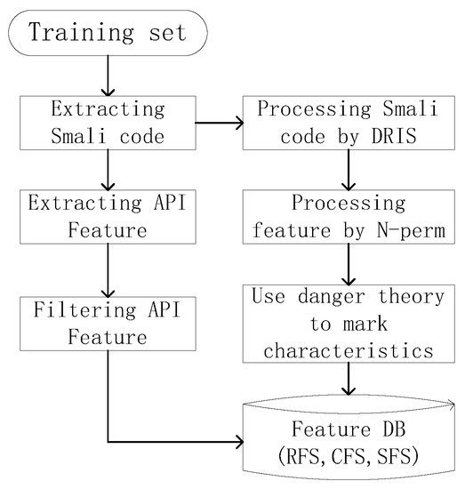 For these reasons, based on the Dendritic Cell Algorithm (DCA), this paper presents an Android malicious code detection method. This method is mainly divided into two parts: training and detection. For the training part, the main task is to extract features from the APK through Dalvik reduced instruction sequence (DRIS) and N-perm, and to mark the characteristics as a different level of danger by danger theory. DRIS and N-perm are introduced, respectively, in Section 3.1 and Section 3.2. After the training part, the experiment can gain a feature database which is composed of a risk feature set (RFS), a common feature set (CFS) and a safe feature set (SFS). In a feature database, each characteristic will has a danger level and security level . For the detection part, the main task is to classify suspicious APK by using an improved DCA and feature database. The feature extraction of the detection section is the same as the training section.