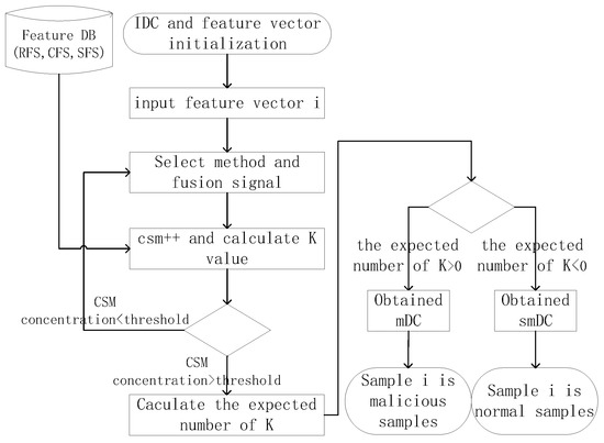The process of iDCA is simply described as follows. Firstly, the experiment extracts DRIS and suspicious APIs from the APK file, and generates the feature vector by feature fusion. An application corresponds to a feature vector. Then, the experiment initializes the iDC with the i-th feature vector, calculates the CSM concentration in a DC environment and the k value of each method in the i-th feature vector. If the CSM concentration is higher than the threshold value, then calculate the expected of k marked . If is larger than zero, the iDC state would migrate to mDC. If is smaller than zero, the iDC state would migrate to smDC. Through the final state of DC, it can be judged whether the feature vector belongs to malware or not. The iDCA detection flow is shown in Figure 7.