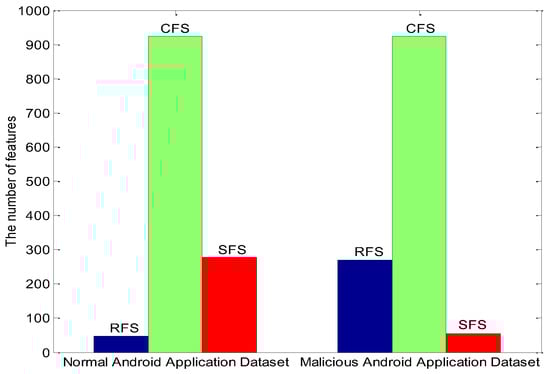 (1) S is the set of features, which is composed of 1233 features extracted from DRIS and 17 features extracted from suspicious APIs. The feature set S is divided into three sub sets—Risk Feature Set (), Security Feature Set (), and Common Feature Set ()—which are defined as follows. , defined by Definition 4, includes features that only appear in malicious applications. defined by Definition 5 includes features that only appear in normal applications. defined by Definition 6 includes features that appear in both malicious applications and normal applications:
