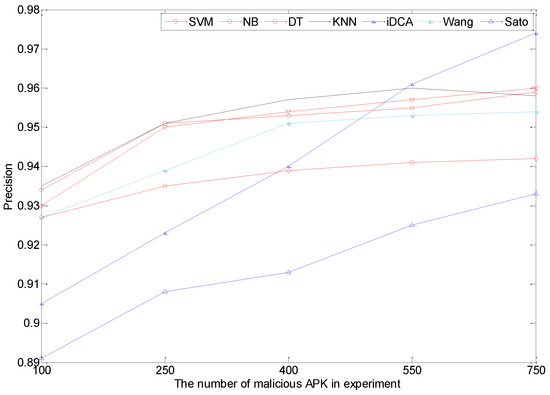 The malware samples are regarded as positive in the classification model. TP is the number of correctly classified malware; FN is the number of malware samples wrongly identified as benign; FP is the number of Google app samples misclassified as malware, and TN is the number of correctly identified benign applications. From the 10-fold cross-validation, when the number of malicious samples is 750, the test results are shown in Table 3. As is shown in Table 2, compared with SVM, NB, DT, KNN, Wang [34], and Sato [12], iDCA has a higher detection accuracy rate when the number of malicious samples is 750. However, from Figure 9, it can be seen that the performance of iDCA is poor when the number of samples is small.