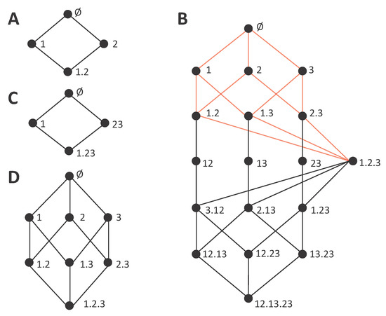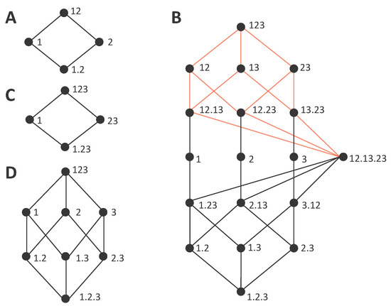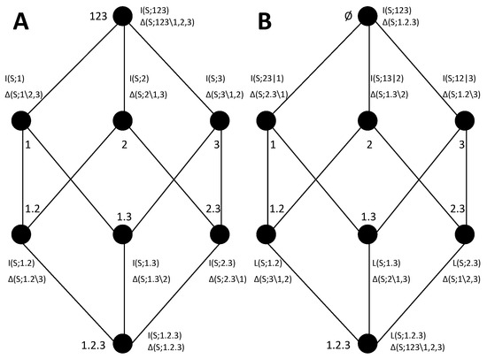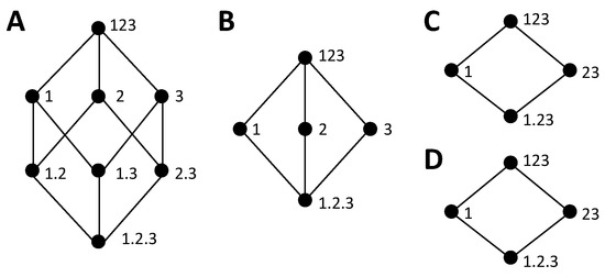 that is, for two collections α and β, if for each source in β there is a source in α that is a subset of that source. This ordering relation is reflexive, transitive, and antisymmetric. The lattices constructed for the case of and using this ordering relation are shown in Figure 1A,B. The order is partial because an order does not exist between all pairs of collections, for example between the collections at the same level of the lattice. In this work, we use a different notation than in [21], which allows us to shorten the expressions a bit. For example, instead of writing for the collection composed by the source containing variable 1 and the source containing variables 2 and 3, we write , that is, we save the curly brackets that indicate for each source the set of variables and we use instead a dot to separate the sources.