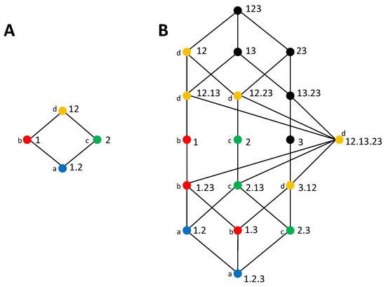 Mapping between the incremental terms of the bivariate lattice for 1, 2 and the full trivariate lattice for 1, 2, 3. (A) The bivariate lattice with each node marked with a different color (and also, redundantly, with a different lower case letter, for no-color printing). (B) The trivariate lattice with the nodes coloured consistently with the mapping to the bivariate lattice. In more detail, the incremental term of each node of the bivariate lattice is obtained as the sum of the incremental terms of the nodes of the trivariate lattice with the same color.