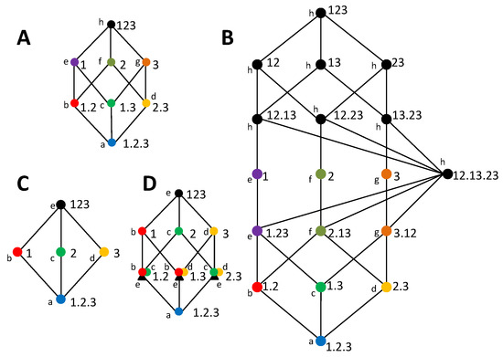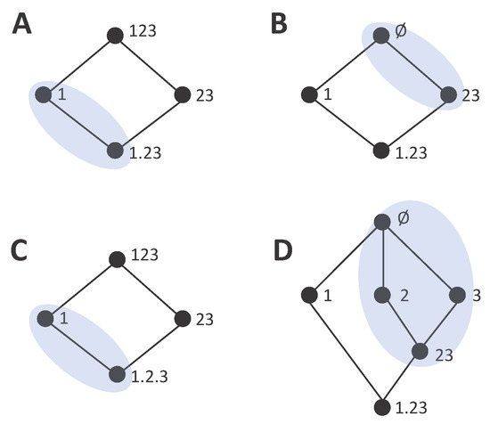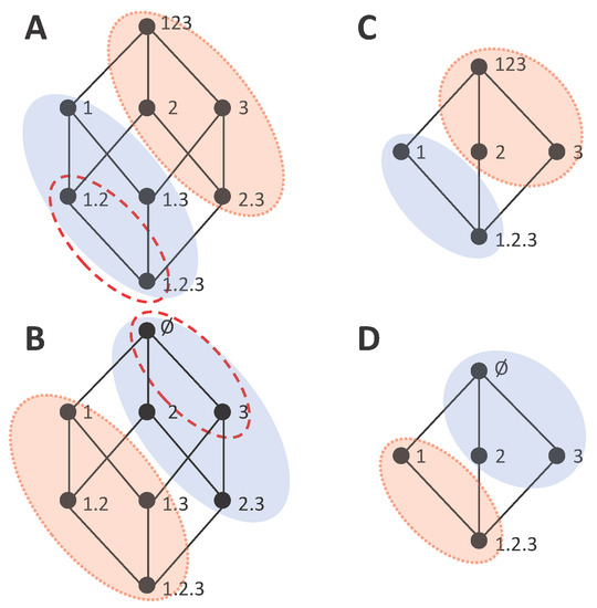 Figure 3A,B further shows how the incremental terms of the sublattice of Figure 1D can be broken down as a sum of the incremental terms of the full lattice. However, in general, the fact that each incremental term of the smaller lattice can be expressed as a combination of the incremental terms of the bigger lattice, does not mean that each incremental term of the latter is related to a single incremental term of the former. This is illustrated in Figure 3C,D. The set of collections of the lattice in Figure 3C is a subset of the set of the lattice in Figure 3D. However, now each incremental term of Figure 3D contributes to more than one incremental term of Figure 3C. For example, , but also , with contributing to both. Furthermore, since the incremental terms of the full lattice can only contribute once to the decomposition of , the fact that an incremental term of Figure 3D contributes twice positively, is balanced by a negative contribution to another incremental term of Figure 3C. Combining the correspondences of Figure 3C,D and Figure 3A,B, we can see that the incremental terms of the full lattice of Figure 3B contribute in an overlapping way to the incremental terms of Figure 3C, that is, there is no function assigning a single term in Figure 3C to the terms of the full lattice. To understand which lattices produce overlapping projections, let us examine in more detail the constraint of Equation (11) for and in the lattices of Figure 3C,D. Each cumulative term is obtained as the sum of all incremental terms from nodes reached descending from the node of the cumulative term (Equation (7)). In Figure 3D, is the infimum of 1 and 2, that is, the first node common to the descending paths from 1 and 2. This means that the incremental terms from this infimum and nodes reached descending from it contribute to both and . If these nodes are not present in Figure 3C, then some upper incremental term will have to account for them. In this case, the node is present in Figure 3C, but is not and thus has to be accounted for both in the incremental terms of 1 and 2. This type of loss of the infimum node does not occur when the full lattice is reduced to the one of Figure 3A. For example, the infimum of 1 and 2 is and this node is preserved, even if the intermediate nodes and are not. Therefore, in general, preserving the structure of the infimums when taking a subset of to construct a lattice is what determines if a non-overlapping projection exists or not. If for two collections in the subset their infimum collection is not included, then Equation (7) can only be fulfilled for both cumulative terms by a multiple contribution of the incremental term of the infimum in the full lattice to the incremental terms of the smaller lattice.