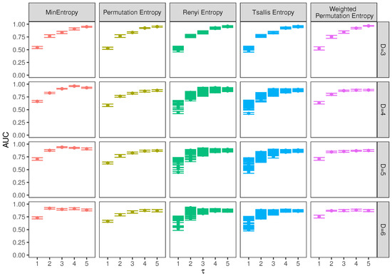 Area under Receiver Operating Characteristic (ROC) curve calculated by 10-fold cross-validation is plotted (area under the curve (AUC) sd) against the time delay τ. The figure is divided by the different entropies and by the embedding dimension D for better understanding. It reveals that—independent of the entropy used—the best model for classifying is when the discrete Probability Distribution Function PDF is calculated for embedding dimension and time delay , with the exception of the MinEntropy that the model for and is slightly better, but with no significant difference.