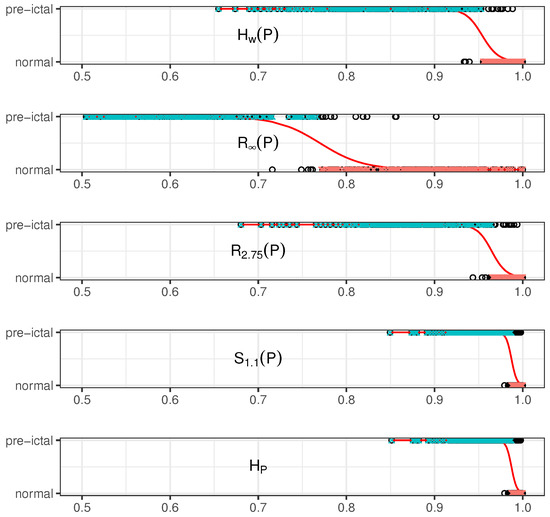 The permutation entropy as a classifier between normal and pre-ictal EEG signals has the strongest correlation with a , with a p-value near to zero (Table 1). This means that for every the moves up, the odds ratio (the quotient between the probability of classifying the EEG signal as pre-ictal and the probability of classifying the EEG signal as normal) decreases by 28%. In other words, small increments on the significantly affects the probability of detecting pre-ictal states. Adding noise to a signal increases the permutation entropy, so noisy EEG signals would result in lower Sensitivity (i.e., the ability to detect pre-ictal EEG signals). On the other hand, MinEntropy has the weakest correlation with a , meaning that for every the moves up, the odds ratio decreases only 1.2%, and it is still an excellent classifier. This behaviour in a classification model indicates robustness, because small increments in the value of the entropy does not affect the classification. This holds because all the entropies are on the same scale. The models with the highest (in absolute value) β coefficient have a more pronounced slope in the S-shaped curve, leading to a classification more sensible to changes. Figure 2 shows the five models presented in Table 1. The actual class of the observations are plotted as black circles. The curve in each plot represents the probability of the signal of being a pre-ictal EEG signal, according to the model, as a function of the value of the entropy. When this probability is larger than , this observation is classified as pre-ictal EEG (blue crosses), and when it is less than , as normal (red crosses). For all that is stated before, MinEntropy is the most robust model, followed by the model that uses weighted permutation entropy .