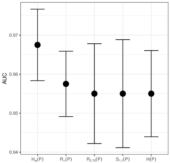 Table 1 presents the best models for each entropy, sorted by decreasing AUC. For the Renyi Entropy and for the Tsallis Entropy , the parameter is also chosen according to the classification performance (account for the fact that there is a model for each value of the parameter), that is Renyi Entropy with and Tsallis Entropy with . The entropy that has the best classification performance is the weighted permutation entropy, followed by the MinEntropy by less than a standard deviation, and the remaining entropies have similar performance in terms of the AUC (Figure 3). All the entropies have an excellent and similar performance in terms of Accuracy, so the overall classification error is small for the cut-off point , and for this c, looking at the Specificity and the Sensitivity, all the models are more accurate classifying pre-ictal EEG signals as such than classifying normal EEG correctly.