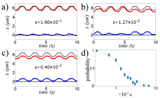 Figure 1. Trajectory of the beads 1 (blue) and 2 (red) (a) no synchronization, ε = 1 . 60 × 10 3 ; (b) weak synchronization, ε = 1 . 27 × 10 3 ; (c) complete synchronization, ε = 0 . 40 × 10 3 . The black solid line corresponds to the position of the optical traps versus time. (d) Probability to be in a synchronous state ( p NS ( T ) ). Notice how the synchronization increases monotonically when the system approaches the critical temperature. The error is purely statistic Δ p i ( T ) = 1 / N ( T ) .