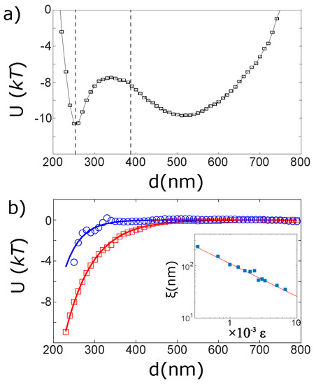 Figure 2. (a) Total potential U total ( d ) as a function of the distance between the spheres surfaces d = x 2 x 1 2 R . The potential has been measure using the probability density function ρ ( d ) of d. It is possible to divide it in three main parts. At small distances, electrostatic repulsion avoid the sphere to stick together. At further distances the optical potential dominates and creates a local minimum of energy. The Casimir potential changes with temperature and allow the critical force to dominate the dynamic of the system. (b) Critical Casimir potential corresponding to ξ 30 nm, T c T 2 . 0 K, blue circles, and ξ 70 nm, T c T 0 . 5 K, red squares. Solid lines corresponds to a fit to Derjaguin approximation, Equation (1), keeping the correlation length as a free parameter. Inset) The correlation lengths obtained by the previous fit are represented as a function of the reduced temperature (blue solid squares) while the theoretical evolution is represented by the red solid line ξ = ξ 0 ε ν , where ε = ( T c T ) / T c is the reduced temperature, ξ 0 = 1.4 nm is the characteristic correlation length of the mixture and ν = 0.63 is the universal exponent associated with the transition.