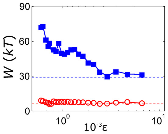 Figure 3. Energetics of the system as a function of the reduced temperature ε. Work W φ produced in the collective motion of the particles φ (red empty circle). Work W r in the relative motion of the particles r (blue solid squares). W φ shows no dependence with the Casimir force, due to its purely dissipative nature. On the other hand, W r has a dependence in ε, as the Casimir force starts to dominate the dynamics. Horizontal dashed lines corresponds to the pure dissipative work in each coordinate. Notice how the higher value of the relative viscosity appears in a higher value of W r even far from the critical point.