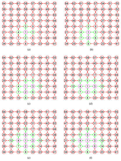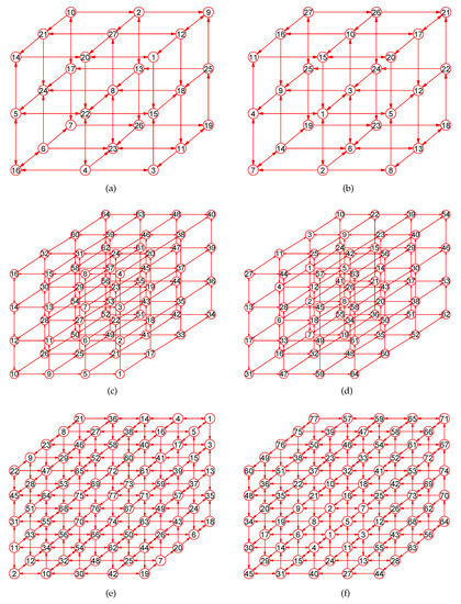 The MaxEm digraphs of three digraphs , , and . (a) The grid digraph with 27 nodes and 54 directed edges; (b) The MaxEm digraph of ; (c) The grid digraph with 64 nodes and 144 directed edges; (d) The MaxEm digraph of ; (e) A digraph with 77 nodes and 196 directed edges; (f) The MaxEm digraph of .