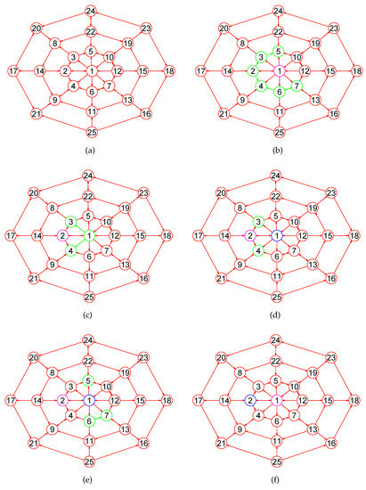 - Except the nodes added into , it uses a queue Q to store the intermediate nodes to be added to . After performing Step 1, it sequentially determines whether or not each node is in Q. If u is in Q and the number of nodes added into is less than 2 in the preceding procedures, it puts u into and simultaneously deletes u from Q. Otherwise, it inputs u into Q.
