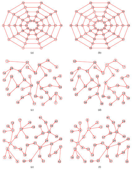 The MaxEm digraphs of , , and . (a) A digraph with 50 nodes and 90 directed edges; (b) The MaxEm digraph of ; (c) A directed tree with 39 nodes and 38 directed edges; (d) The MaxEm digraph of ; (e) A directed tree with 42 nodes and 41 directed edges; (f) The MaxEm digraph of .