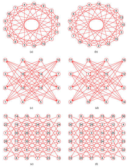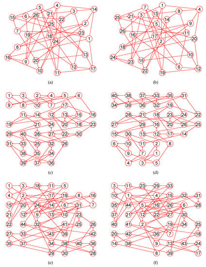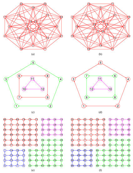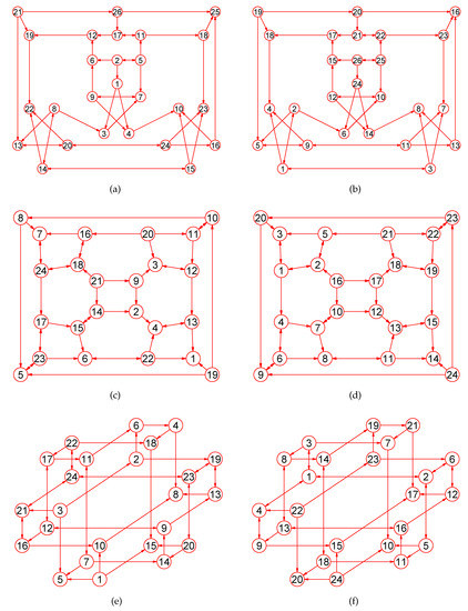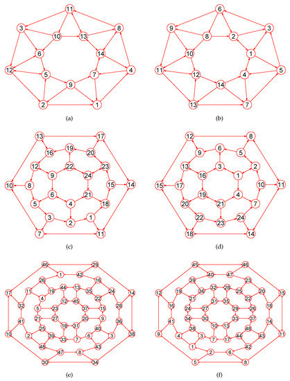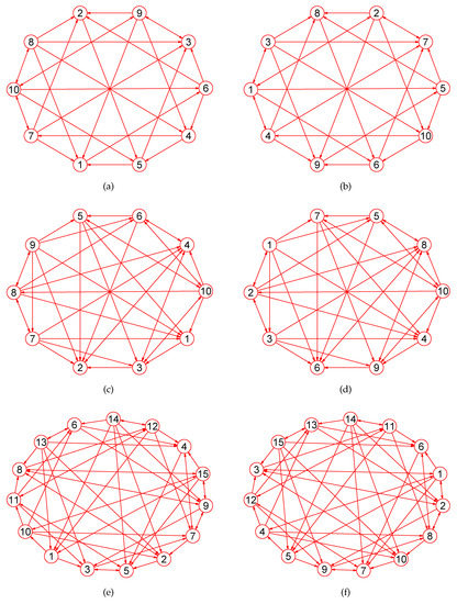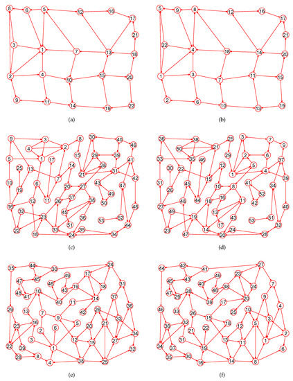 We selected a digraph set to test the accuracy of our algorithms. Using our own software platform, we randomly produced a large number of digraphs as the test cases, including Figure 3e, Figure 5c,e and Figure 6. To increase the breadth and depth of our testing, we also select many test cases from the library of benchmarks [29] and online library [30] includings Figure 3a,c, Figure 4, Figure 5a and Figure 7, Figure 8, Figure 9, Figure 10, Figure 11, Figure 12, Figure 13, Figure 14, Figure 15, Figure 16, Figure 17, Figure 18, Figure 19, Figure 20 and Figure 21.