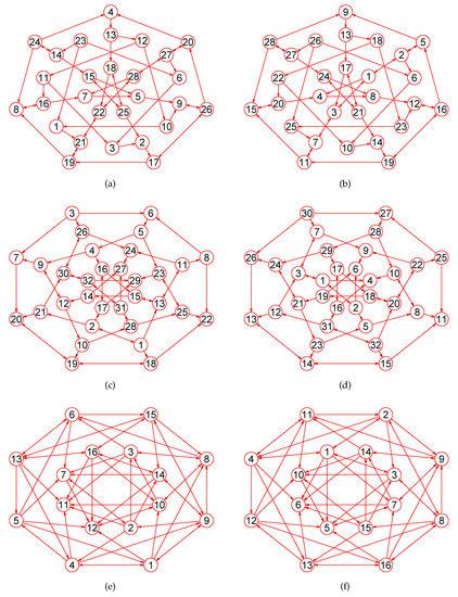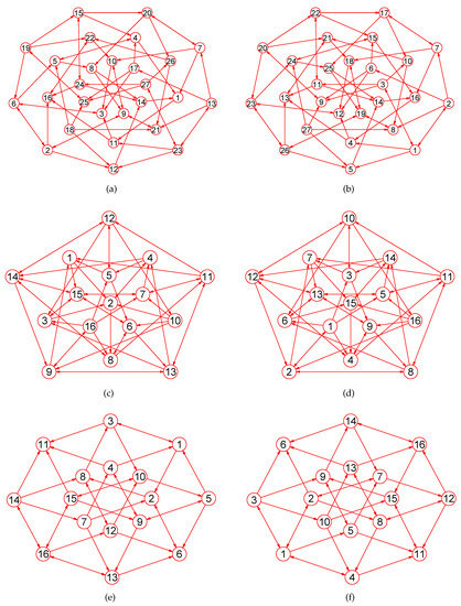 The MaxEm digraphs of three digraphs , , and . (a) The coxeter digraph with 28 nodes and 42 directed edges; (b) The MaxEm digraph of ; (c) The Dyck digraph with 32 vertices and 48 directed edges; (d) The MaxEm digraph of ; (e) A Shrikhande digraph with 16 vertices and 48 directed edges; (f) The MaxEm digraph of .