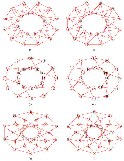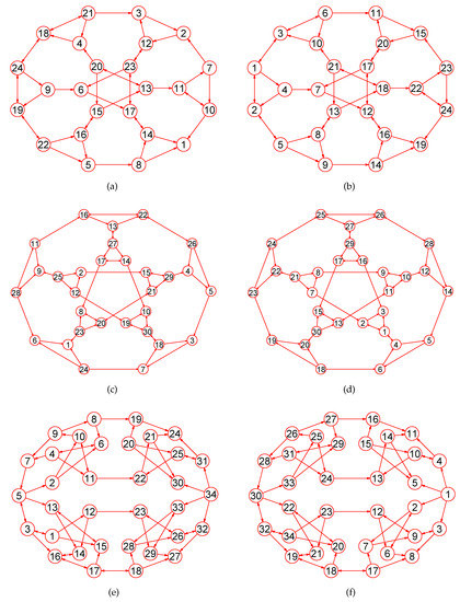 The MaxEm digraphs of three digraphs , , and . (a) The 6th order cube-connected cycle digraph with 24 vertices and 36 directed edges; (b) The MaxEm digraph of ; (c) A triangle-replaced digraph with 30 nodes and 45 directed edges; (d) The MaxEm digraph of ; (e) The Thomassen digraph with 34 vertices and 52 directed edges; (f) The MaxEm digraph of .