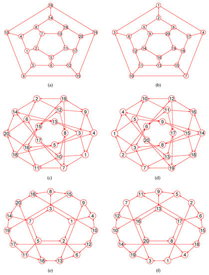 The MaxEm digraphs of three digraphs , , and . (a) A Hamiltonian digraph with 20 nodes and 30 directed edges; (b) The MaxEm digraph of ; (c) The Folkman digraph with 20 nodes and 40 directed edges; (d) The MaxEm digraph of ; (e) The snark digraph with 20 vertices and 30 directed edges; (f) The MaxEm digraph of .